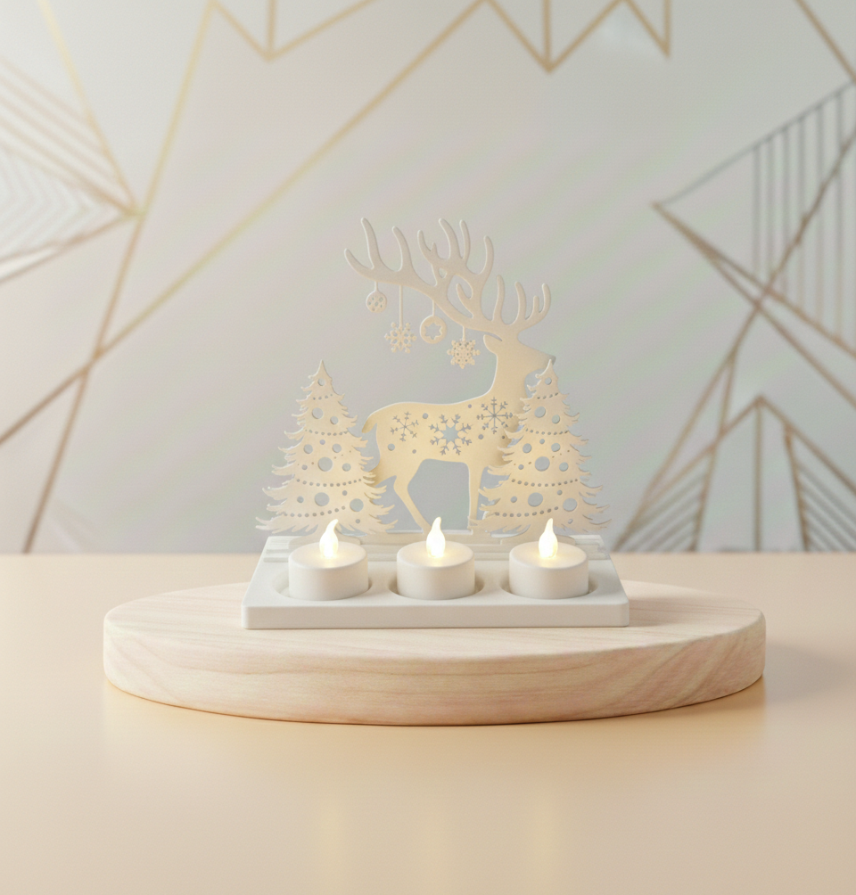 Tegu on meeleoluvalgustiga – komplektis olevad elektroonilised LED-küünlad valgustavad kuju seestpoolt, tekitades kuuskede ja kitse vahel hubase valgusemängu. Ideaalne öölauale, aknalauale või kaminasimsile.
