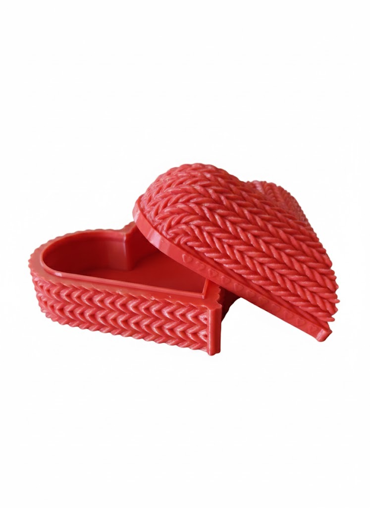 See lummav kootud tekstuuriga südamekujuline karp on täiuslik paik Sinu kõige kallimatele pisiasjadele või ehetele. Karbi kaas on modelleeritud meenutama pehmet villasest lõngast kootud pinda, luues kontrasti tugeva materjali ja sooja visuaalse välimuse vahel. Ideaalne kingitus, mis ühendab praktilisuse ja armsa disaini.